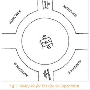 In December 2012, I staged four scenes of Brecht’s Life of Galileo in a 200-seat black-box space on the University of Montana’s Missoula campus. I pared the script down to nineteen pages and eight characters. I worked with five actors, a stage manager, a costume designer, a composer, and a vocalist. A public audience of about eighty people witnessed the performance on December 10, 2012. The actors performed in a twenty-foot diameter white chalk circle drawn on the black stage floor. Chairs were arranged around the circle leaving four aisles for entrances and exits (fig. 1). The pianist played at an upright piano set at the end of one aisle just outside the circle. Galileo’s table sat in the center of the circle for scenes one and four.