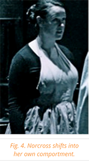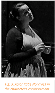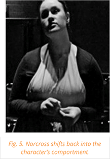 The workshop included a series of walking exercises in which actors observed one another’s movements, took notes on their comportments, and held short discussions. There were many discoveries in the workshop, including one actor who noticed another actor who vigorously swung her arms tightly to her sides. The actor responded to her spectator’s note by admitting that she was conscious of her weight. She articulated that perhaps her unconscious tendency was to walk quickly and swing her arms close to her sides in order to make herself appear more slender. In a journal entry about the workshop, another actor wrote, “[t]he exploration of my physicality strips layers from me and shoves me into a state of vulnerability. From this state, I am able to analyze myself more freely and mostly without attaching imagined meaning to my own perceptions of my physical self” (Hodgson 2012). This simple experience of looking at their own bodies and asking why they move the way they do seemed to help make room for the actor to build their character’s comportment. Making the actors conscious of their own comportments and why they move the way they do was an important first step because rather than assigning imagined meaning—as they would for their characters—they uncovered actual possible meanings behind their own comportments. This step gave them the tools with which they would build their characters’ comportments.