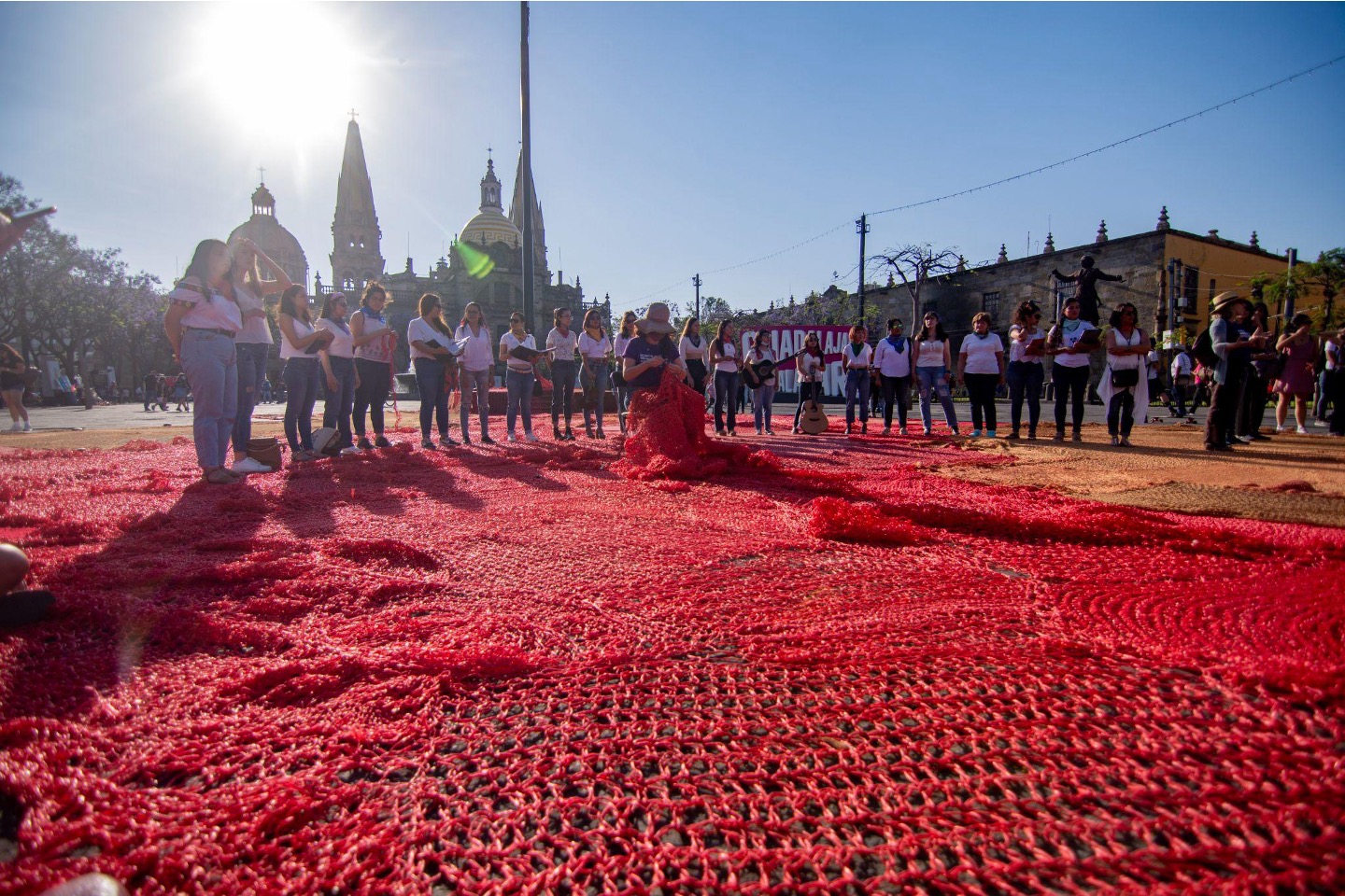 Colectiva Hilos is an interdisciplinary feminist collective that originated in 2018 in Guadalajara, one of the three biggest cities of Mexico (Oyarvide 2020). This collective has more than ten members who are mostly based in the same city. On 7 of March 2020, after two months of collective weaving in public spaces like Parque rojo (Red park) where about 150 people participated, they placed the woven red fabric under the statue of “la madre patria” (mother nation). The size of the fabric resembling a net is of 240m2. They also carried it in a procession towards the roundabout of “the disappeared ones” (Oyarvide 2020).