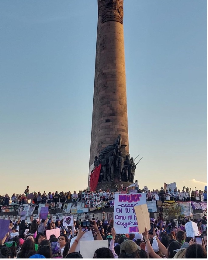 Figure 2: Documentation of a protest at the Roundabout of the Disappeared Ones. Fragments of the red net created in Sangre de mi sangre can be seen on the left side of the photograph. Image taken from Colectiva Hilos Instagram account.
