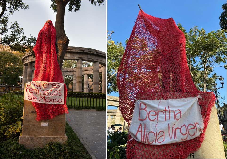 Those “subaltern memories” are constantly denied through official dominant narratives. In one of the performances organized during March 2023 by Colectiva Hilos in Guadalajara, the knitters covered the statues in the roundabout of “illustrious men” with their woven nets and placed the names of “illustrious women,” those women who look for their disappeared loved ones. The signs were placed on top of each net. This action included reading the testimonies of women that fight for justice in Mexico (Franco 2023). This act of disruption of dominant narratives re-signifies who is culturally and socially worthy of being recognized as “illustrious” and publicly celebrated.