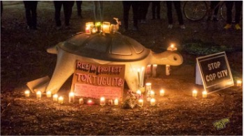 Memories are also shared, like at vigil for Tortuguita (Tort), a queer, Venezuelan environmental activist who was killed by Georgia State Patrol Troopers on January 18, 2023. The ongoing and collective mourning of Tortuguita signifies a transformative, communal experience of going through immense loss. Since Tortuguita’s murder, organizers all over the world have found ways to honor Tortuguita through vigil, protest, creative interventions and sometimes a mixture of all three. Many of the spaces that have been organized to remember and honor Tortuguita have included their mother, Belkis Tehrán. At a memorial service for Tortuguita in March 2023, community members and friends lit candles, shared photos, spoke, and placed a menagerie of flowers, branches, pinecones, and stones on the ground close to the Weelaunee Forest to honor the life of their friend and family member. Out of the many memorial services and vigils for Tortuguita, this one has a special place in my memory because Belkis, other family members, and loved ones spread Tort’s ashes in the forest. Many of us who continue to refuse the logics of cop cities all over the world, fight in memory of Tortuguita, and Belkis’ activism certainly provides so much loving stewardship to the people and the land that I continue to learn from.