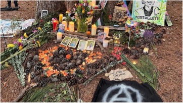 From watching the video it’s clear that Tort’s mother, Belkis, knows that the friends who gathered under the raindrops that day are consumed by sadness and love for Tort. She offers the mourners solace by saying “be happy.” She says Tort provided us with an example. Having met Tort only once, I knew that they were an example for kindness and love. From the stories that I’ve listened to, Tort has had a profound impact on so many people’s lives. They have immensely impacted people they met and people who only know them through death. Belkis wants the example of her child to be alive in a substantive way, a way that is about that action and “not just talking.” She reminds the crowd that we are still living and that living implores us to give them a life through our actions and what we continue to fight for and against. Indeed, Tort’s life does give an example of how to be in grief and action, and their life mattered. The way that communities all over the world mourn Tortuguita are proof of what we know. The reminder she extends about us still being alive, and still being able to enact change and struggle is inherent to the resistance against oppressive regimes. Through the performative demonstration of mourning those that we have lost, and the things we have lost access to, we can honor those people and things, and we find creative ways to keep coming together to struggle in their memory. When we struggle with our loved ones in our hearts and minds, we are connected to their commitments of disrupting state violence and we honor the lives they lived through our actions. As we mourn together, and lose people, we grow in our support of the people who are still here.
