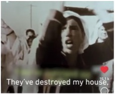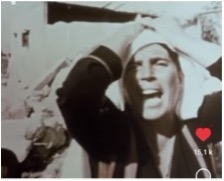 For example, I notice the moan in a small fragment on Instagram (Middle East Eye 2024) of a 1973 documentary, Scenes from Under Occupation in Gaza, by Mustafa Abu Ali, that shows a Palestinian woman throwing her hands frantically towards the camera. She is standing in front of her house that has been struck by an Israeli bomb as she looks at the rubbles that was once her life. She repeatedly pulls her arms towards her head, to throw them back into the air in the viewer’s direction. Her hands become a raging mantra, her face twisting and pulling into deep groans that express her desperation over the destruction of her life and that of her people. This repeated choreography of thrashing arms, hands and contorted facial gestures becomes a curse, a seething curse. A curse enacted onto every person who watches such a devastation with a sense of apathy and disinterest. A stretched-out groan dances through her face translated by each facial muscle that shrieks and reflects the pain and suffering she feels inside her body. We see a woman whose whole body becomes the wailing utterances of her heart. Her body’s gesturing is totally in sync with that deep groaning wound inflicted by the Zionist airstrike on her house.