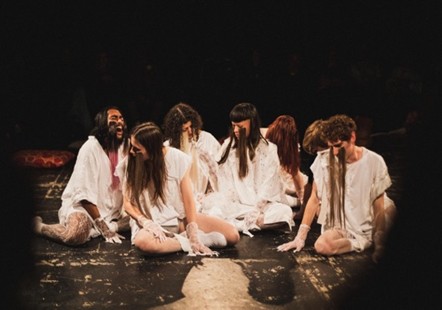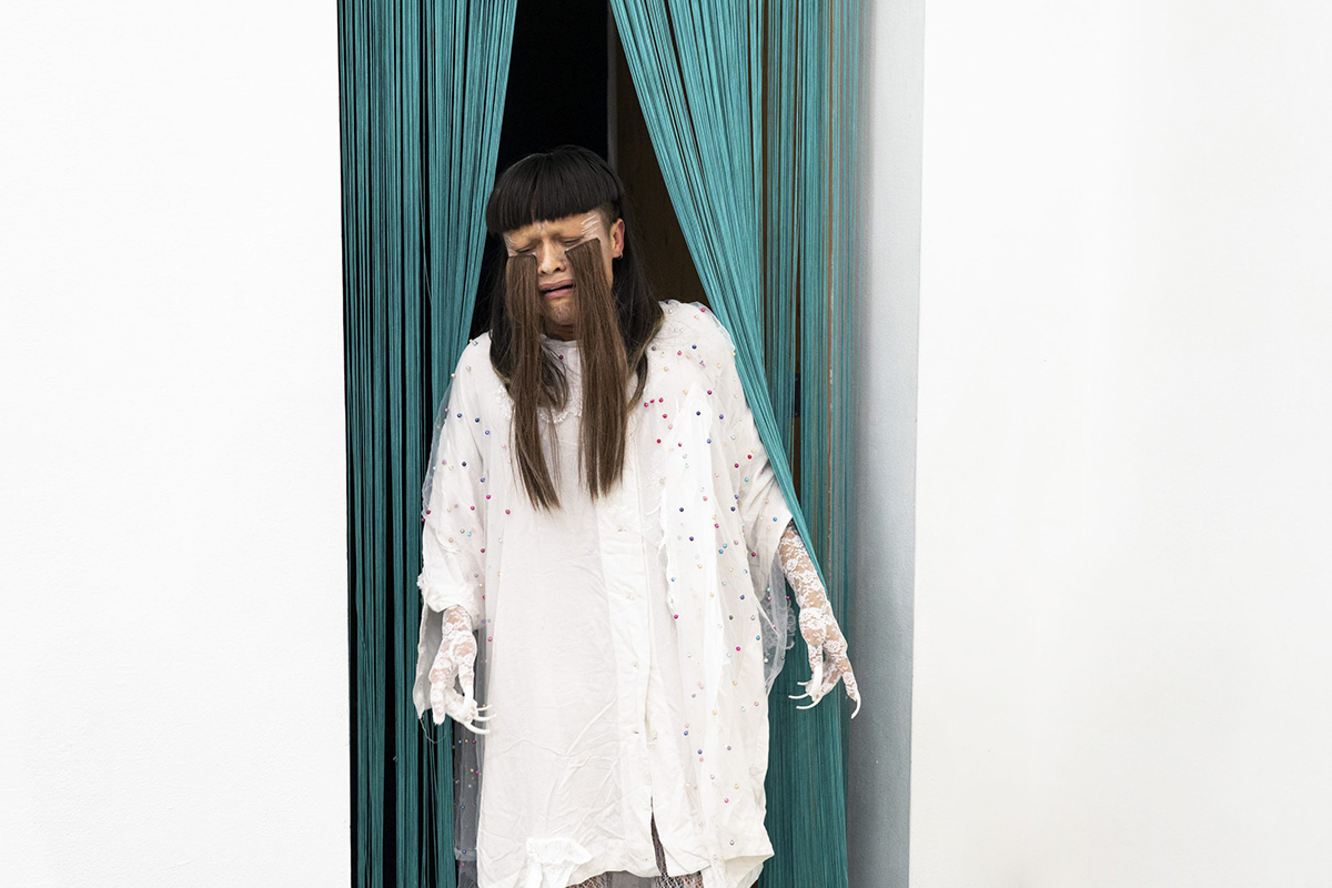 Cloaked as Lashes, dressed in the white layered garment that is beaded with plastic pearls and strands of hair flowing down my cheeks, I lent my voice to the moan as an elongated mourning song on repeat that treats the performative space as a palpable space of loss. It is through Lashes’ performance, swaying in an unbalanced way while repeatedly hitting the chest, that I aim to honour and preserve this dying tradition of professional mourning. By using the transformative capacities of the performance space, my body activates the loss that is naturally present in the space. As Lashes, my body moves ambiguously between spectator and performer. Dressed as Lashes I lent my body and my voice to an improvised moaning song on repeat that filled the space with an affective load and dragged both spectator and performer into the immediacy of feeling more than one feels capable of, “to feel more than I feel, I feel.”