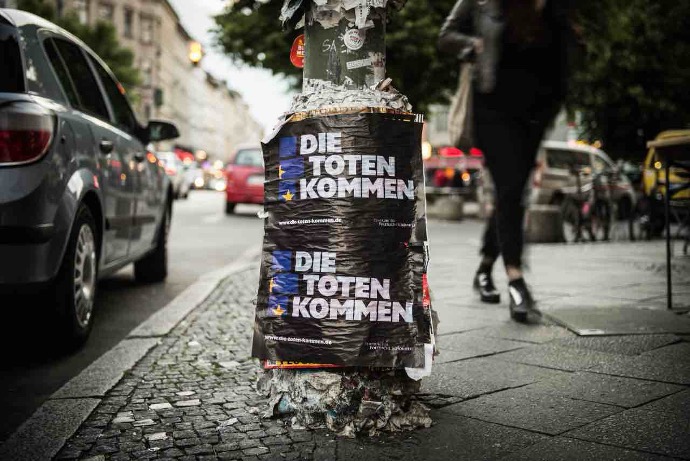 A few days later, the CPB staged another public demonstration in which hundreds of people marched to the Federal Chancellery to construct a “Cemetery to the Unknown Immigrants.” Some of the marchers wore black suits and carried styrofoam gravestones. Others came bearing flowers, shovels, and spades. Upon reaching the Platz der Republik, an expansive green space in front of the Chancellery, the marchers broke through police barricades and began digging ditches using all the tools at their disposal, including their bare hands. In the scuffles that followed, several people were arrested for illegally trespassing on the lawn. Nonetheless, the protestors managed to dig nearly one hundred makeshift graves, which they decorated with flowers, candles, and signs that read, “Borders Kill” and “Nobody is illegal” (von Bieberstein and Evren 2016).