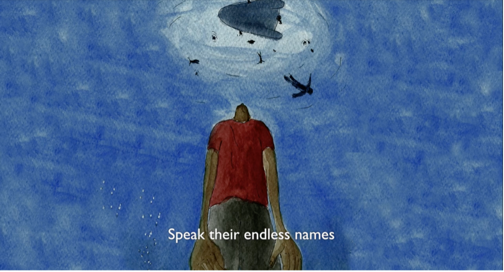 The narrator goes on to pronounce the names of all 368 Eritreans who drowned in the Lampedusa shipwreck. The names are spoken in the Tigrinya language and their meanings are simultaneously translated into English and Italian. According to Yimer, the intention behind the strategy of naming the dead was “to defy the attention and patience of the public, in order to bring back the numbers of the tragedy to the reality of the names” (cit. Federica and Ramsey 2019, 38). Before naming the dead, the narrator makes one final pronouncement that gives insight into what Yimer believes is at stake in mourning their deaths and commemorating their memory: