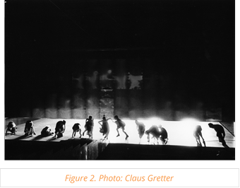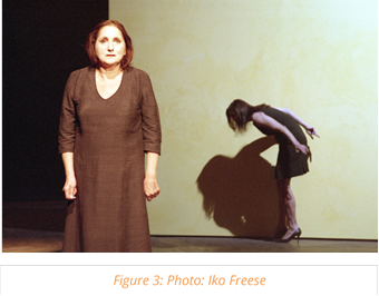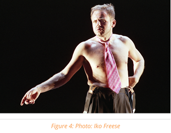 Unlike the mass choruses in Max Reinhardt’s stagings of classical drama, Schleef’s chorus has a presence that is strongly characterized by moments of absence. On the one hand, the physicality of the chorus was emphasized by their running up and down the raised walkway close to the audience; on the other, the chorus subverted the power of the audience’s gaze by performing in darkness or behind the audience, or huddling on the floor. In this way, the performance of the chorus avoided assuming a visual form and could not be fixed as an image. The particularly strong impact resulted from the fact that the chorus could not be classified as either historical or fictitious. Thus, the strangeness of the pathetic utterances could not be tied down to a specific source; the unleashed affect went beyond any link to the dramatic context or a specific group, and to some extent became an urgent concern for now and for everybody.