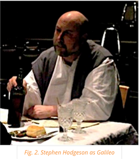 In a sense, it became a diegetic commentary on their character’s behavior not via narrative language, but via physical performance. In another particularly effective example, Hodgson found a moment of Galileo’s behavior that he had found remarkable because it happened to strike a chord with him personally. The Curator (Hugh Bickley) is trying to convince Galileo to develop something useful for the city, but Galileo wants money for his astronomical research: