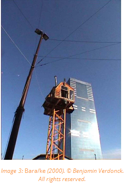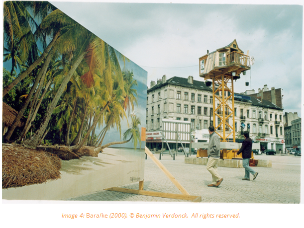For his long durational and site-specific art project called Bara/ke (2000), Verdonck lived seven metres above ground for fourteen days in a self-constructed pile dwelling, in the middle of the Bara Square in Brussels, an intervention he later repeated on a square in Antwerp.[6] He operates in the ‘now’ and looks at the future from there, trying to overcome idealized images of the past. Verdonck’s tree houses are reminiscent of Henry David Thoreau’s cabin and hence of the Romantics’ sublimation of reclusive life in nature, as described in his book Walden. However, he recasts the hut in an urban environment. A gigantic reprint of an exotic ‘natural’ place functions as an ironic remainder/reminder of the discourse of Romantic sublimation, of our idealized but unattainable ‘image’ of a ‘lost’ origin.
