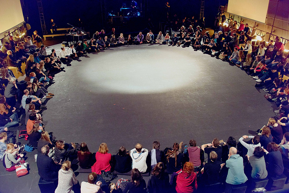 After having passed this threshold the audience themselves had become cooperation partners of our experimental research setting. A part of that black box reminding many visitors to Plato´s allegory of the cave. For, wide Hall G, with its black walls, had been cleared to form one huge space, so that there might be the impression of a dark underground cave. Instead of the usual rows of seats there were mobile, black cubes as seats as well as camp beds, freely distributed across the room, and at the side walls there was a double row of narrow stage risers which could also be used for sitting. For the philosophers & artists a number of different research islands had been installed.