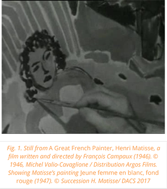 In his 1964 series of lectures, The Four Fundamental Concepts of Psychoanalysis, Jacques Lacan briefly mentions a “delightful example” (1981, 114) that Maurice Merleau-Ponty had given in an excursus to his book, Signs (1964c, 45–6). Lacan describes it as “that strange slow-motion film in which one sees Matisse painting” (114). What the psychoanalyst is referring to is a scene in the documentary Henri Matisse by François Campaux, a 16-mm black-and-white sound film from 1946.