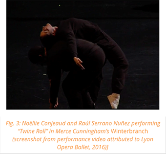 Carolyn Brown hits the mark when she refers, in the passage quoted earlier, to “the ethos of Winterbranch: darkness, foreboding, terror, devastation, alienation, doom” (2007, 477). Cunningham must have intuited that in 1964 it was time to produce a more topical piece, to expose the fact that falling bodies are eloquent, they are not just “facts” to be manipulated or carted away. Winterbranch suggests that because we are human, even simple shifts in weight can speak, can have something to say—even if it is simply that the body is in danger of being hurt. In that sense, Winterbranch is from beginning to end a meditation on the body as a sensate, living organism subject to injury. The pulley- and piston-like figures underscore the fragility of the dancers as they lift and set one another down. The make-up Rauschenberg devised for the dance points to the element of risk: the black smudges under the eyes of the dancers at once protect them, literally, from the blinding lights and suggest that vulnerability; the black smudges recall to spectators the fact that the dancers, as sensate beings, require protection. And this sense that dancers require protection characterizes Cunningham’s approach to dance in general. He is known to have adjusted his choreography—even if chance derived and supposedly fixed—to prevent one dancer from colliding with another, or to better control a lift. Choreography was always, for him, a manifestation of care as well as an unfolding of the seemingly impossible permutations suggested by chance. Thus it is not surprising that elements of care are built into his technique. When I spoke to two of the dancers cast to perform the phrase “leaning towards,” Chiara Paperini and Tylor Galster, I learned that they were both experiencing pain in their lower backs while performing the hinge.[27] Trained largely as classical ballet dancers, they were not used to executing the kind of off-center hinges that are a primary building block of Cunningham’s technique and choreographic vocabulary. During the rehearsals Goggans, a seasoned Cunnngham teacher as well as dancer, advised Paperini and Galster to make use of the muscles of the abdomen to support the lower back in the hinge (as all Cunningham-trained dancers learn in technique class). The care the dancers had to exercise to protect their backs while performing the hinge must be considered a significant part of the actualization of the dancing “fact,” a component of its “shape” as performed. It is precisely this aspect of the actualization that constitutes what is gestural in the gesture: a sensitivity to the body as a support, as a lived support. If Agamben and Cunningham share an interest in the suspension of “communication” in favor of “communicability,” if both view that suspension as opening the ethical dimension, Cunningham adds a further element to which he, as a choreographer and dancer, is acutely sensitive. That element is the dancer’s own experience—as a medium, a support for meaning, but also as a person living and shaping that support-ness, that “media character,” on a stage.