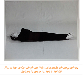 The studio still thus captures something central to the piece, not “falling,” but rather the state of “having fallen,” the weight of the stilled body as a material object that, when presented on the stage, implies a narrative, a dramatic past (“having fallen”). The question is, then, whether the ethics of Cunningham’s dance should be located in what he consistently represented as his refusal of symbolism, a resistance to culturally over-determined meanings, or whether instead his ethics inhere in both the movement and the presentation context, a set of choreographic and staging decisions that at once confirm those cultural meanings and put them to the test?
