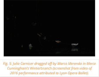 At no point in the dance does the male dancer lie in the position Cunningham assumes for Propper’s photograph. However, near the middle of the piece, a woman, lying still and prone on her back, is indeed wrapped in one of the black carpets and dragged offstage by a male partner (see fig. 5).