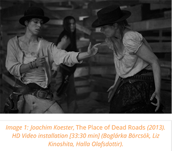 Moving from the gestural rhetoric of liturgy to that of the Western, forms of generic recognisability are at stake in Michael Minden’s essay too. His ‘Ethics, Gesture and the Western’ (2017) begins with a brief discussion of Koester’s The Place of Dead Roads, which I would like to address in more detail before turning to Minden’s argument. Koester’s installation presents a group of four androgynous dancers in nineteenth-century cowboy gear who are engaged in an apparently involuntary, almost feverishly obsessive pantomimic reenactment of the stock postures, gestures and moves of the Western genre: they eye and circle each other chins down, launch into chimeric gun battles, revolve as if lassoing, bounce as if riding a horse, convulse as if being hit by a bullet or even ‘step-dance as if having their feet shot at in the saloon’ (Börcsök 2017).