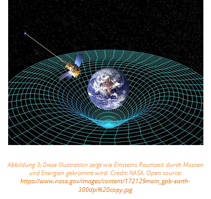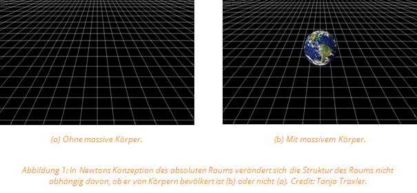 Wenn man Abb. 1 und Abb. 3 vergleicht, werden die Unterschiede zwischen Newtons transzendentem und Einsteins immanentem Raum offensichtlich: Während Newtons Raum nicht von Körpern beeinflusst wird und als umgebender Container, in dem Körper eingebettet sind, konzeptualisiert ist, wird der Raum in Einsteins Konzeption relational durch Massen und Energien verändert. Jost fasst zusammen: „Die Anwesenheit der Materie und damit die Veränderungen der Geometrie der Raumzeit und Beschleunigung wird nun gemessen in Relation zu dieser Riemannschen Geometrie anstelle einer unabhängigen absoluten Euklidischen Geometrie.“ (Riemann und Jost 2016, 130, eigene Übersetzung)