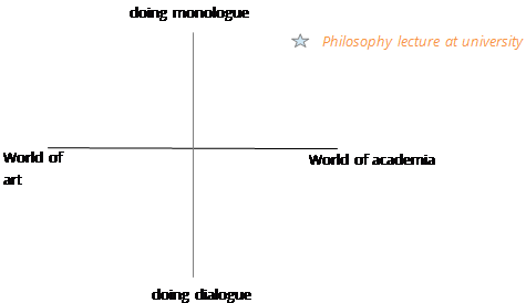Now we provide an example: We choose two pairs of these comparative criteria and put them in a diagram to visualize the territory between the opposing poles, in which a philosophical performance might be situated. And as an example we have put the ordinary, University philosophy lecture in this diagram:
