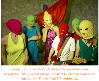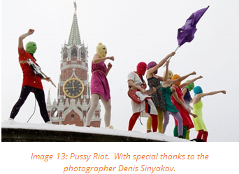 I shall be short and to the point: I want to defend the political importance of the Pussy Riot project, stressing the notion of the political in the mode of socio-cultural activism. I shall do so by highlighting two aspects of this project that for me pertain to a long and distinguished tradition of feminist politics: one is visual and the other musical and although they of course intersect and interact, I want to deal with each separately.[1]