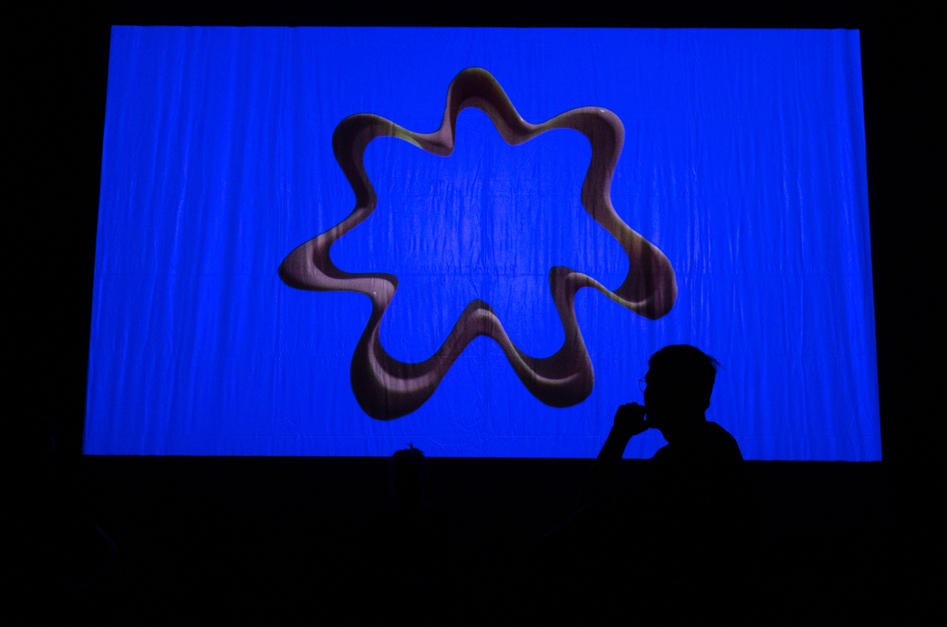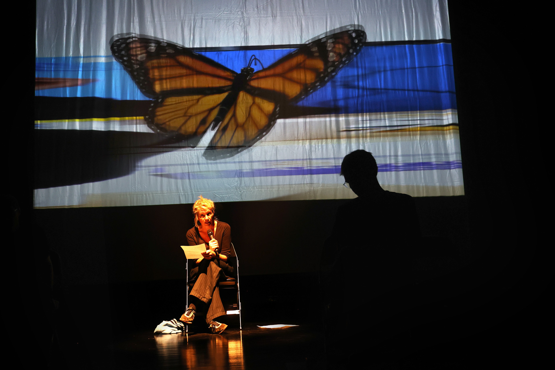 Anke Haarmann on stage with a butterfly animation projection and Torben's silhouette during the Problems of Performance Philosophy Conference, Helsinki June 2022