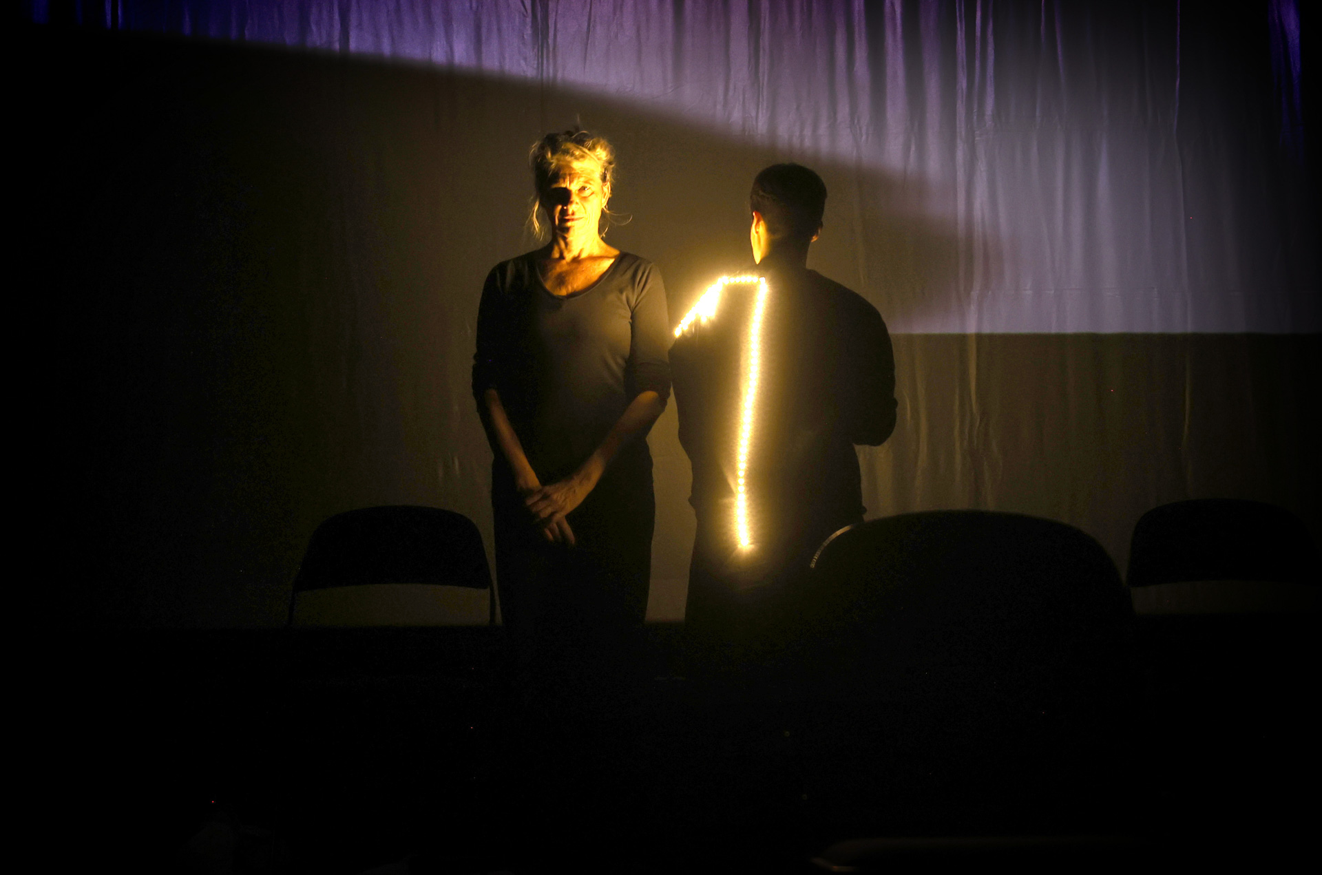 Barbro Scholz exploring social space and illuminating Anke with wearable lights during the Problems of Performance Philosophy Conference, Helsinki June 2022