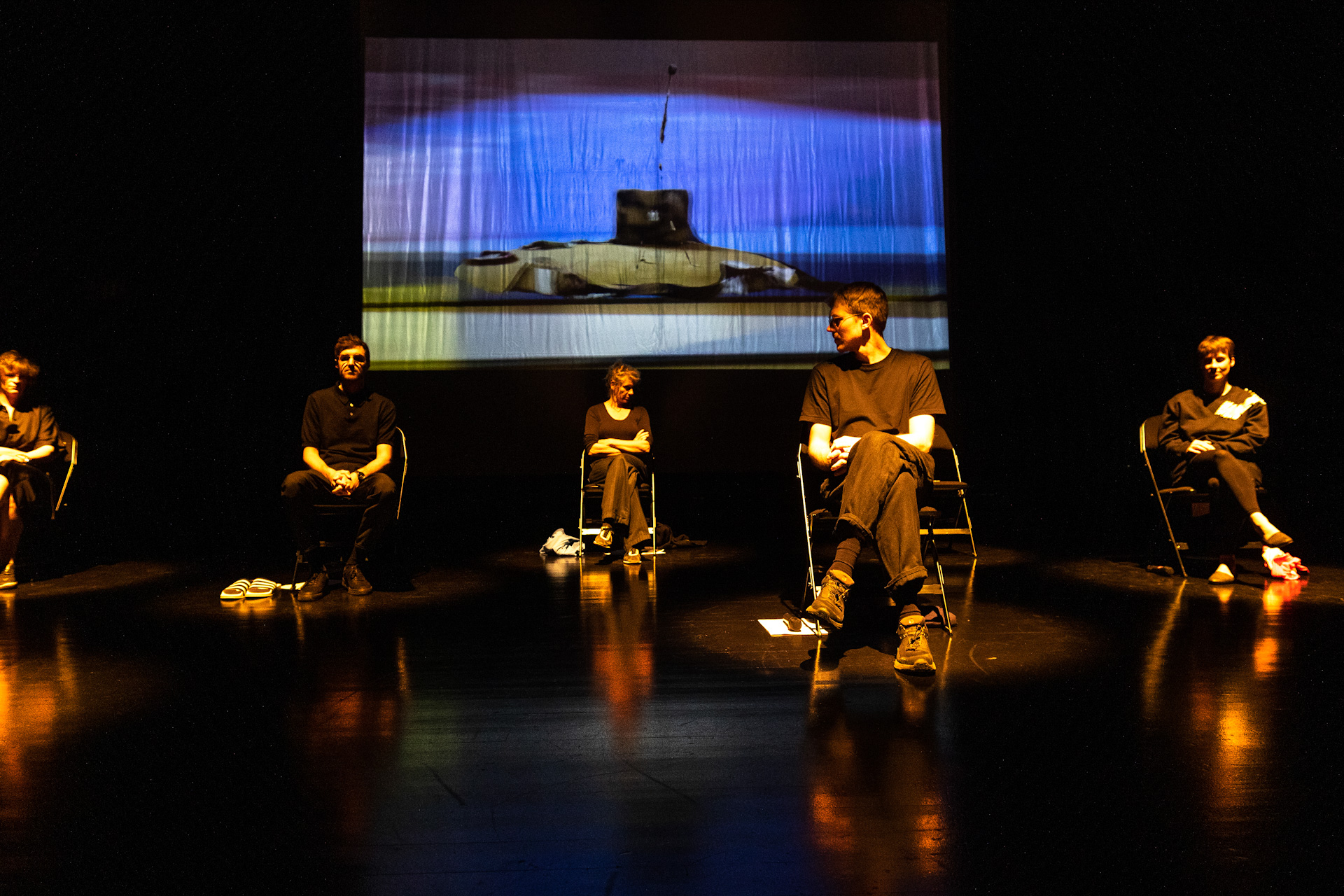 Here we are together on stage. Sitting on chairs, each in our own spot, with a certain distance between us, creating a constellation in space. What’s going on here? What’s being addressed? What are we negotiating? And by what means? As in astrology, lines of connection can be drawn between each position or point on the stage; can be interpreted into a composition to tell a whole story, a story of the whole, even when, in fact, there may be no actual lines. In the background behind the stage, building a backdrop to the scene, a film is being projected. It’s a film we made about our work and our lines, or breakdowns, of connection. It’s our film. It shows how everything is mixed up. It’s not always clear who’s who in the film. The camera circles around the table in our work lab, where we can now be seen sitting, standing, or lingering. The camera oscillates between movements and close-ups. The images sometimes dissolve into motion blur, animations appear as visual comments on what is being said: a butterfly, a ball with scribbles, a crooked handcart—not drawn or pushed, but driving in circles as if by magic. We move in circles too, between our individual points of view and our collaboration in process. One drops into the mix, forgets oneself for a time while thinking something through with the others; then we merge for a moment in concentration until someone gets hungry or needs a break, and then each of us steps out of the gathering, reconstituting a singular entity, creating distance in order to reconsider.