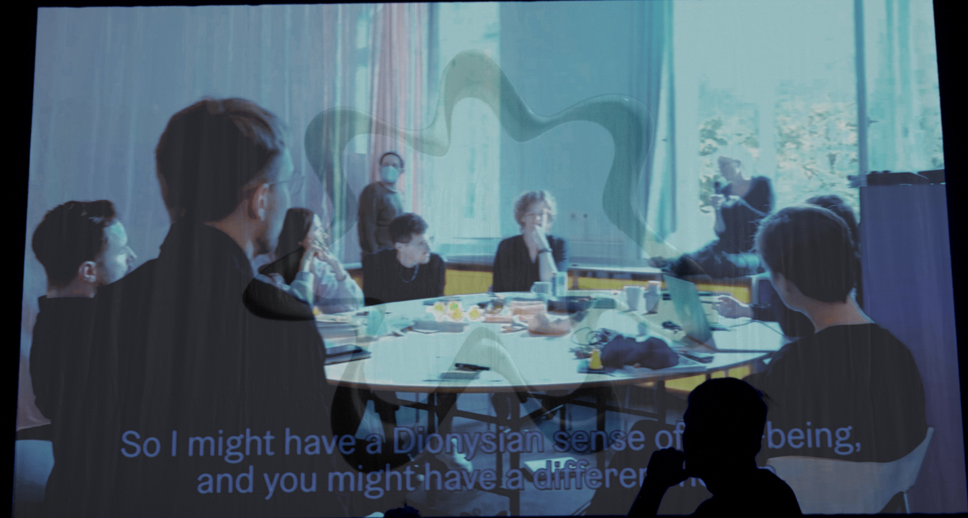 In the context of our performance on stage at the Performance Philosophy conference, the aim was not only to reflect on subjective and embodied experience in multiplicity, but also to locate and perform it physically and spatially. This is where the limitations of this text become apparent. In Helsinki, physical experiences on stage and positions on research practices were spatially given. Speech acts were characterised by postures and body movements, and the whole scene was set against the background of a film. The cinematic layer was part of our live presentation, during which it rhythmically interrupted our individual positions on stage, demonstrating the continuous oscillation between individual manifestations and negotiations of artistic thinking and group entanglement. The aesthetic dimension of this presentation and reflection on the stage of the “Problems in Performance Philosophy” conference was crucial: its performative, spatial, temporal, situated, physically present, and cinematically represented nature. Not only does it reveal itself in the doing, but there seems to be a sense in which it requires the liveness of performance, which intensifies its presence, for further layers and dimensions of autopoietic entanglement to become perceptible to us—if not also to the/an audience.