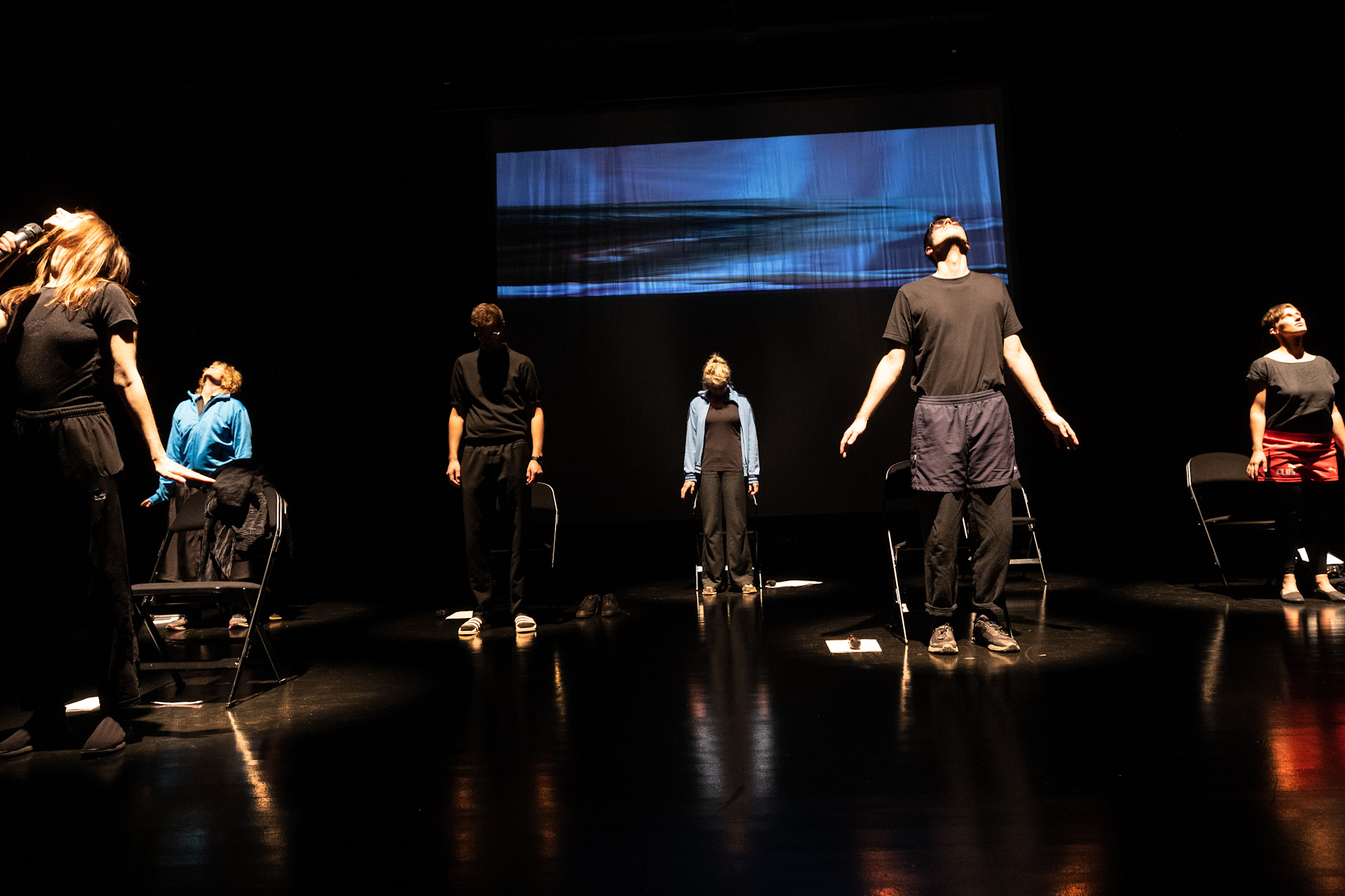On stage the register shifts to a guided aerobics exercise class. (Abrupt transitions are indeed part and parcel of the collective work; they stimulate the urge to draw lines and make connections.) We are called to activate our breathing and to move our limbs. Can the instructions be addressed to the readership now?